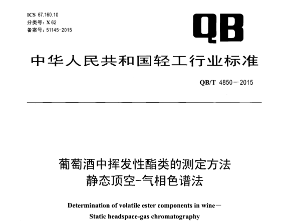 QBT 4850-2015 葡萄酒中揮發(fā)性酯類的測定方法 靜態(tài)頂空-氣相色譜法 適用范圍本標(biāo)準(zhǔn)規(guī)定了葡萄酒中揮發(fā)性酯類的靜態(tài)頂空-氣相色譜法的原理、試劑和材料、儀器和設(shè)備、分析步驟... 更新日期:2020-05-09 下載包(1)