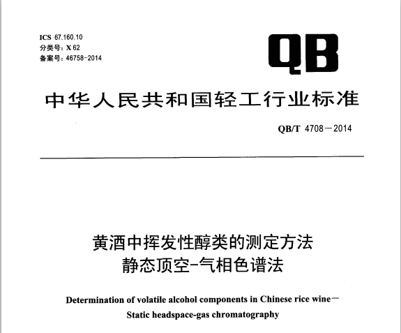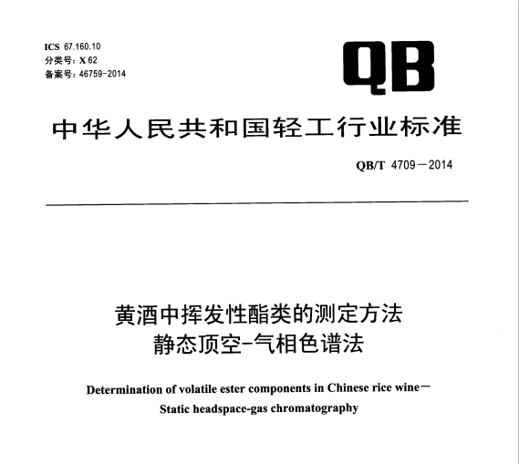 QBT 4709-2014 黃酒中揮發(fā)性酯類的測定方法 靜態(tài)頂空-氣相色譜法 QB/T4709-2014黃酒中揮發(fā)性酯類的測定方法靜態(tài)頂空-氣相色譜法 本標(biāo)準(zhǔn)規(guī)定了黃酒中揮發(fā)性... 更新日期:2020-05-09 下載包(1)
